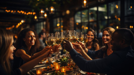 Group of friends toasting with glasses of champagne at party in restaurant