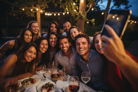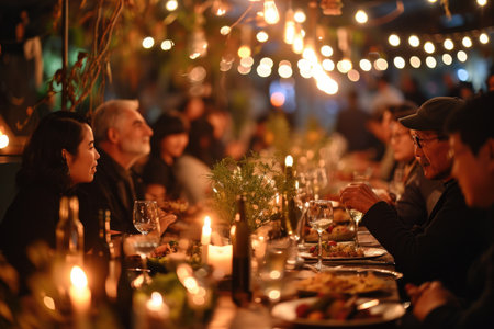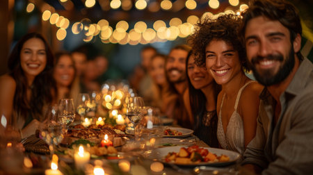 A lively outdoor dinner party features friends gathered around a long table under glowing string lights. The atmosphere radiates warmth and joy as guests enjoy delicious food and each other