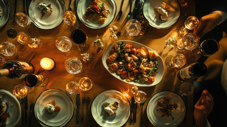 A beautifully arranged dining table with exquisite dishes, wine glasses, and candles creates a warm and inviting atmosphere, perfect for celebrations.