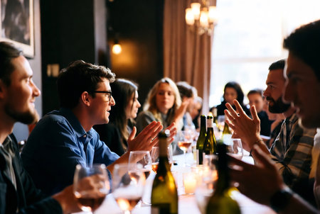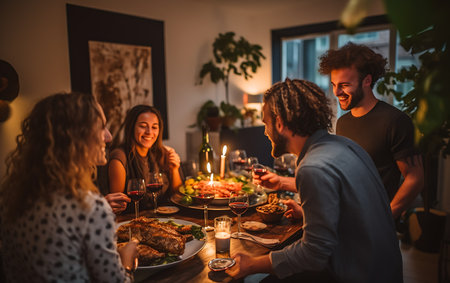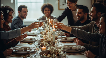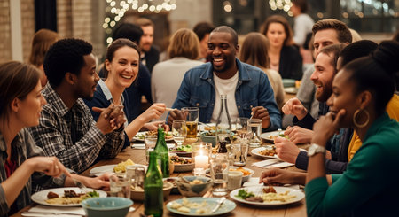 A diverse group of friends enjoys a lively dinner party, seated around a long wooden table. They are laughing, talking, and sharing food in a warm, cozy atmosphere illuminated by soft lights, representing friendship, community, and celebration.