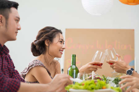 Attractive Vietnamese woman clinking glasses with friend at dinner