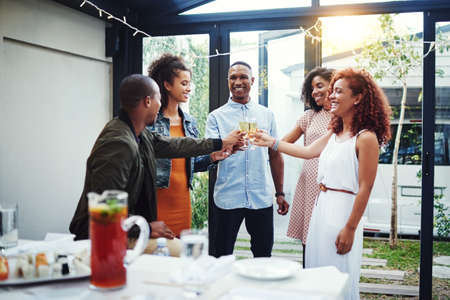 Lets drink to friends who became family. a group of young friends making a toast.