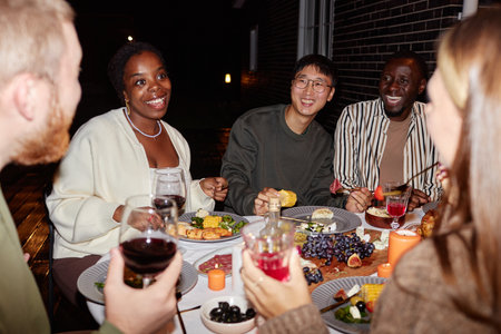 Diverse group of smiling adult people enjoying dinner party outdoors and celebrating holidays together, shot with flash