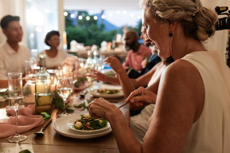 At wedding reception, guests sharing laughter and conversation during elegant dinner. Celebration, gathering, event, dining, joyous, party