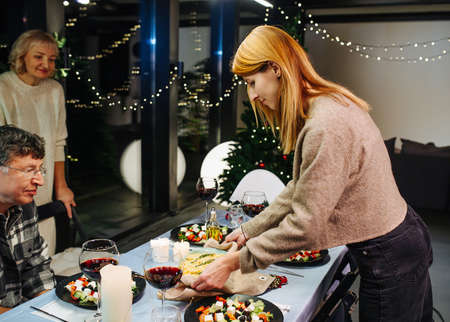 Happy Family of Celebrating together, Sitting at the Table with Delicious Dinner. Young Mother Takes Dish out of Oven Grandparents Admire How Delicious Casserole Looks