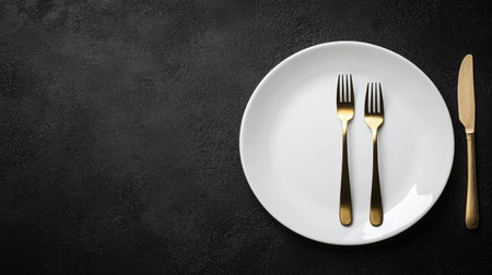 Minimalist served white plate with golden fork and knife, copy space, black background. Generative AI.
