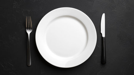 A clean white plate sits on a dark textured surface, accompanied by a fork and knife. This setup suggests readiness for a meal, highlighting simplicity and elegance in dining.