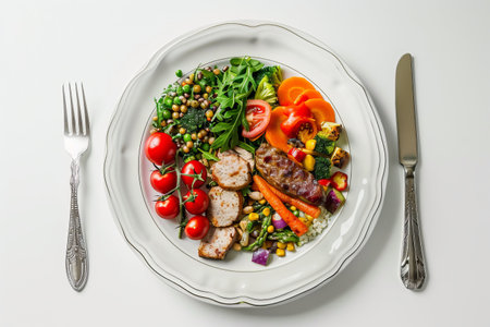 A plate of a meal with vegetables and meat on it, AI