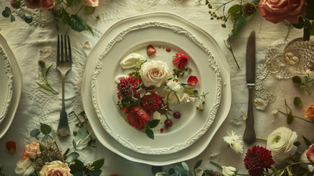 dishes and table details, such as cutlery, decorative plates and flowers, highlighting exquisiteness and attention to detail generative ai