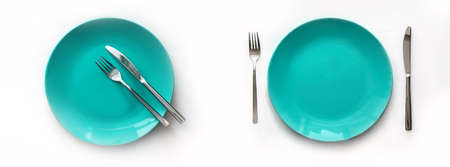 Clean green plate and stainless knife and fork isolated on white background. Served cutlery. Top view