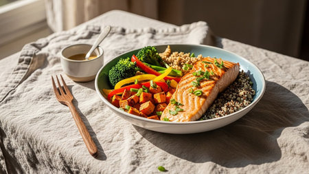 A healthy bowl of grilled salmon, roasted sweet potatoes, quinoa, and colorful vegetables, garnished with chives.