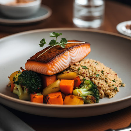 Salmon fillet with quinoa and vegetables on a plate.