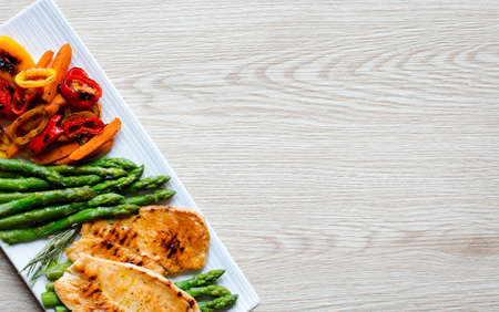 Grilled chicken breast fillet with roasted vegetables. concept healthy food. flat lay.