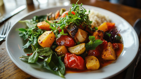 A beautifully plated vegan vegetable dish, featuring roasted vegetables, leafy greens, and a vibrant sauce, perfect for a gourmet meal