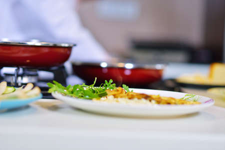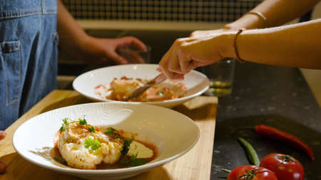 Food concept. The chef is decorated with fresh herbs and flowers dishes in the restaurant. The process of making spaghetti with seafood.