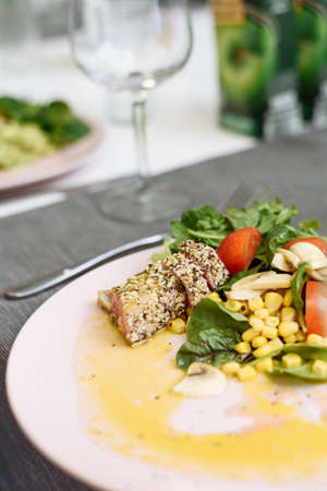Dish by the chef in a premium restaurant. A plate of food in close-up on the table in a premium restaurant, a diet salad