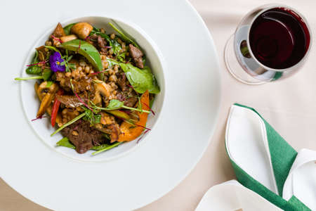 delicious gourmet beef salad dish in white plate