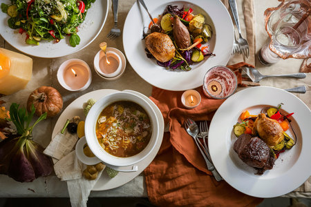 Fall dinner table overhead shot with salad, soup and entrees