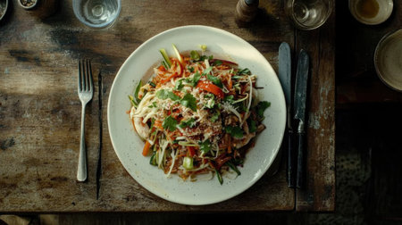 A vibrant spicy papaya salad served on a rustic wooden table. This colorful dish features fresh vegetables and herbs, ideal for a healthy meal. Perfect for food enthusiasts, casual dining, or festive gatherings.