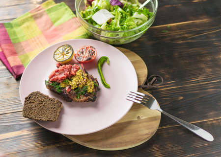 Grilled meat and salad of fresh vegetables on a plate on a wooden background.