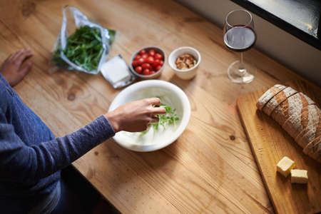 Making a healthy snack. A young woman making a salad in her kitchen.