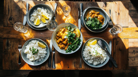 Experience the visual delight of a rustic wooden table adorned with bowls of rice, vibrant curry, fresh herbs, and zesty lemons, perfect for sharing.