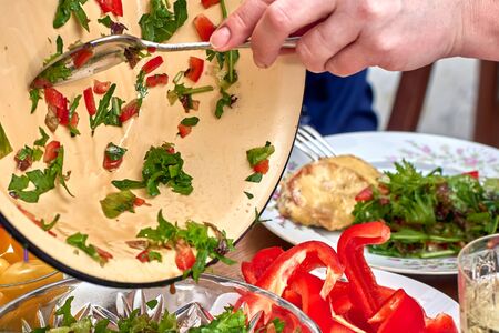 We shift vegetarian salad from a bowl to a salad bowl on the background of the festive table