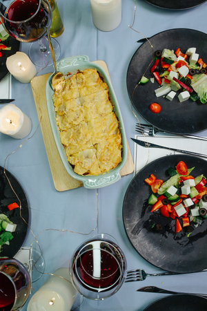Top view of a dining table with salads, red wine, cooked potatoes and candles ready for christmas celebration.