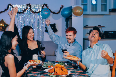Diverse group of young people at dinner table laughing happily while enjoying party at home