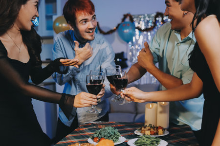 Diverse group of young people clinking glasses during dinner party in cozy warm setting