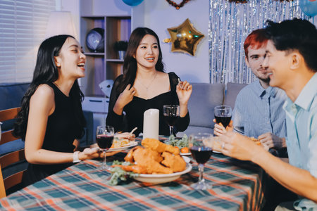 Asian group friends eating dinner at home, they are happy to talk.