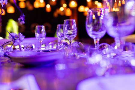 Glasses on the festive table setting. Wedding table decor concept. Table setting in classic style, setout. fine art.