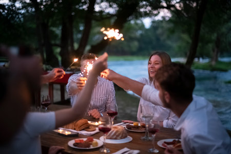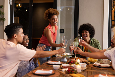 Diverse friends celebrating with toast at outdoor dinner party, enjoying joyful moments. Celebration, friendship, happiness, gathering, togetherness, food