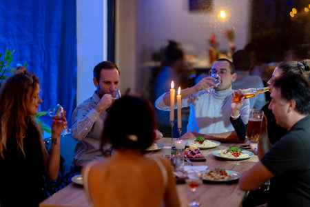 Group of friends enjoying a dinner gathering with drinks in a cozy atmosphere