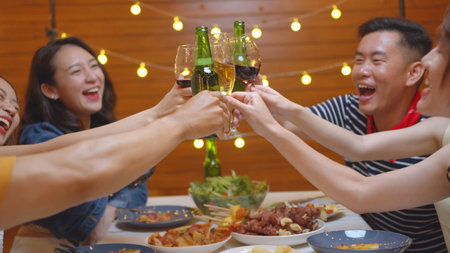 Group of young Asian people party drinking alcohol cheers beer bottle and eating food sitting at table on weekend celebration.