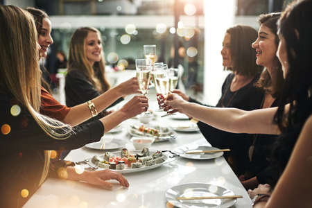 Diversity, dinner and group of people toast celebration together at party. Friends, happy and celebrate with food, wine and friendship for love, support and cheers champagne at business function