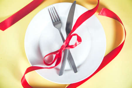 plate with spoon, knife and fork tied with red ribbon on desk