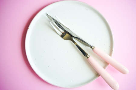 Empty white plate with cutlery on a marble table, saucer, fork and knife. The concept of diet, fasting