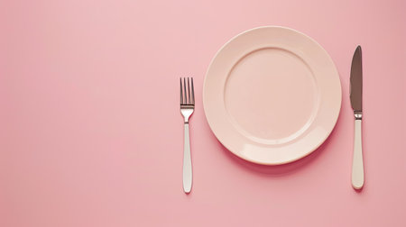 Minimalist silverware and clean plate on soft pink backdrop.