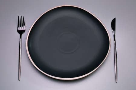 Closeup empty round gray ceramic plate on black background, vintage cupronickel fork, knife with copy space. Concept modern shooting menu from chef, restaurant advert, tableware catalog, top view