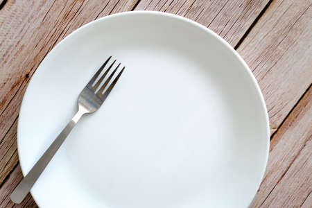 metal Fork and white plate on the Table, Natural Shot