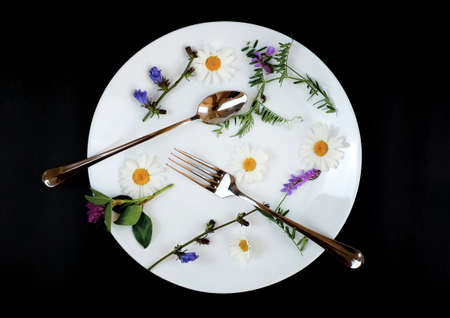 Daisy and wild flowers on white plate with fork and spoon. Black background. Abstract and food concept.