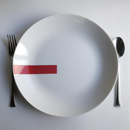 Flat lay of a clean white plate and polished cutlery on a black table surface, ideal for a clean and professional presentation with text space