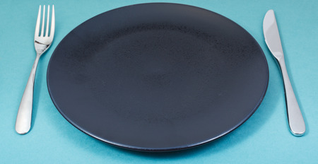 Blue plate on a dark concrete background with cutlery