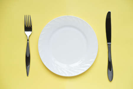 white plate and metal fork and knife on yellow background. reastaurant menu mockup. template for food design. copy space for text and advertising.