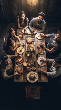 Enjoying dinner with friends Top view of group of people having dinner together while sitting at the rustic wooden table : Generative AI