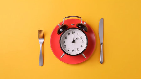 Intermittent fasting, lunchtime, diet and weight loss. Alarm clock and plate with cutlery, top view
