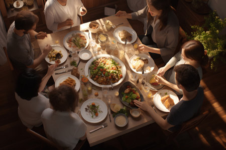 Top view of a group of people having dinner together at home.