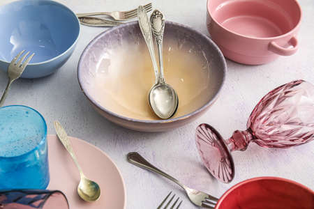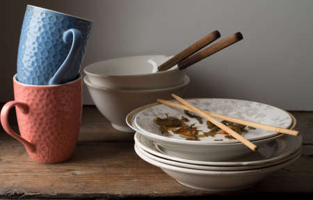 dirty dishes on a wooden table