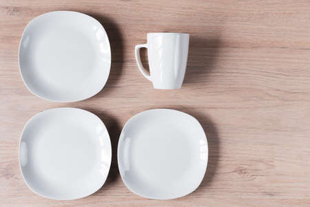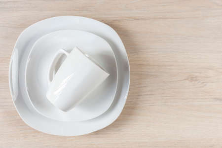 Set of white dishes and cups on light color wooden table. White ceramic dishware set on a wooden table